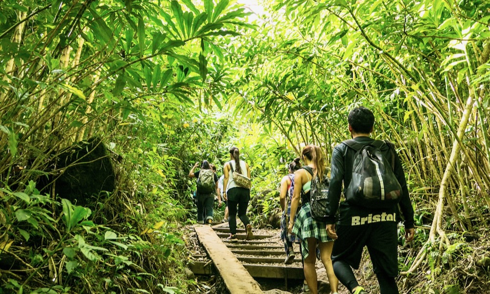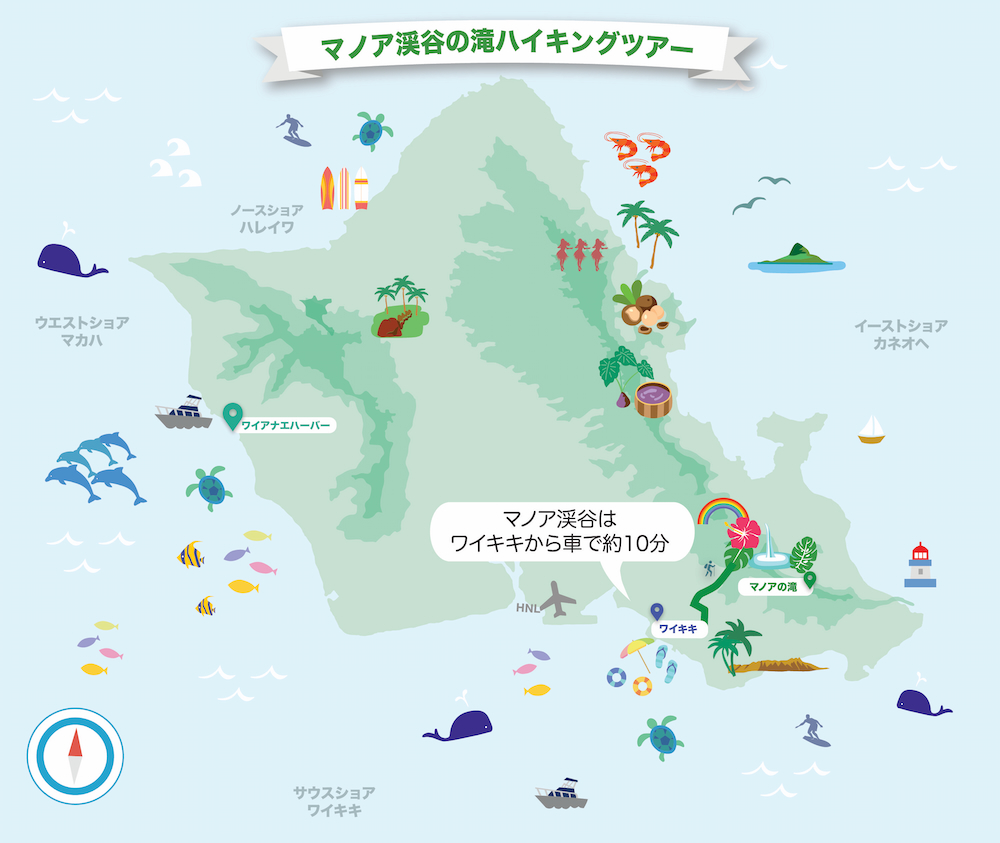 まるで恐竜が出てきそうな、ハワイの熱帯雨林の中をハイキングします。映画のシーンの中に入ってしまったような景色と美味しい空気をお楽しみください。渓谷の中では、さまざまな植物を見ることができます。熟練したガイドが植物やハワイのお話などをしながら森の中を進んでいきます。コースの最後には、約35メートルのマノアの滝があります。このハイキングコースは、地元の人たちにも観光客の人たちにも大人気のツアーです。