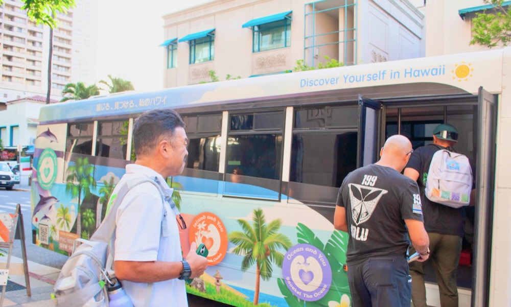 カラフルバスでワイキキ集合場所へお出迎え。集合場所は、5箇所あります。履き慣れた靴と動きやすい服装でご参加ください。滝壺での遊泳をご希望の方は、水着もお持ちください
