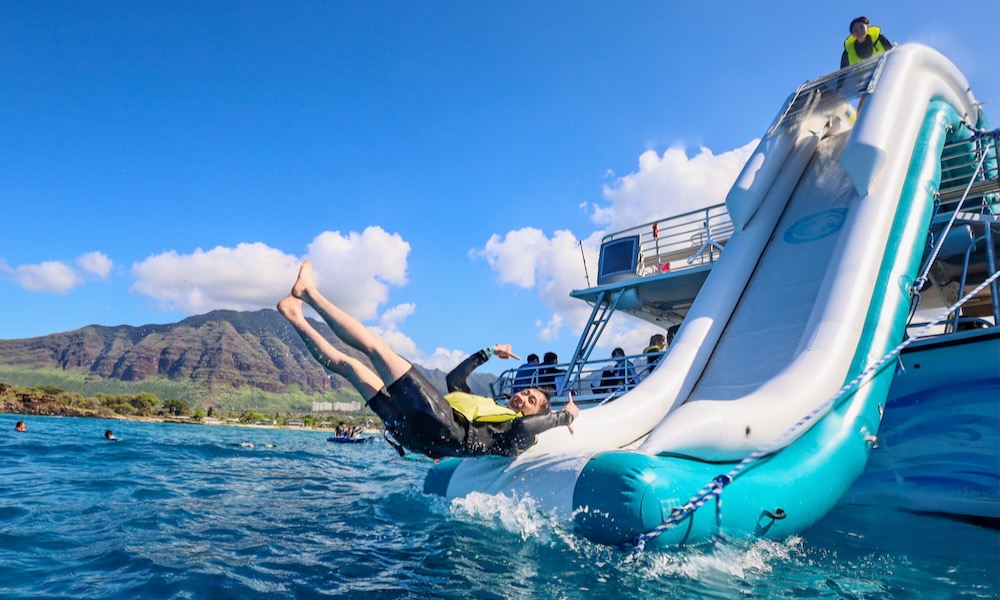 ”新婚旅行で訪れたハワイ。憧れのハワイでイルカも見たいと思い、こちらのツアーに参加しました。早起きでしたが参加したこのツアーではイルカだけでなく運良くクジラにも出会えることができました。また、ホヌも見れることができとても興奮しました。スタッフの方々もとても親切で日本語対応スタッフもいるので安心して参加できました。シュノーケルでは綺麗な海でゆったりと色鮮やかな魚たちも見ることができました。また、アクティビティの滑り台が最高に楽しかったです!帰りの船上ではフラダンスも見ることができ最高の思い出になりました。”(カルチョさん)